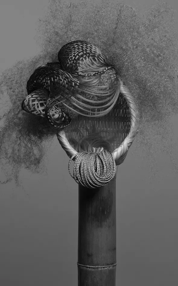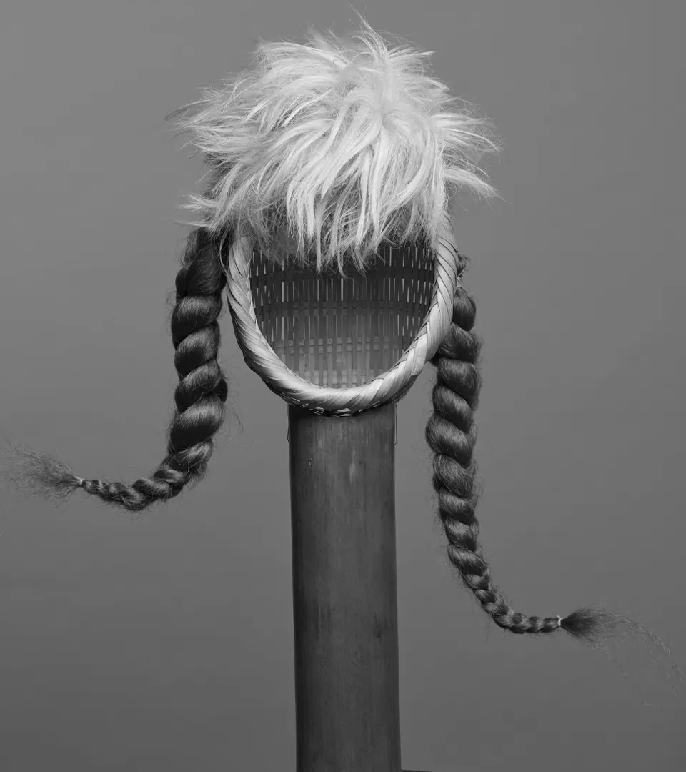 Created for an art festival held on Sado Island, where Hirofumi Kera spent his childhood and youth. The piece draws on aesthetic sensibilities shaped by nature and performing arts, incorporating Sado’s traditional craft—Shichinari baskets—into a striking sculptural form. This headpiece embodies a dialogue between heritage and contemporary expression, merging local artistry with modern design.