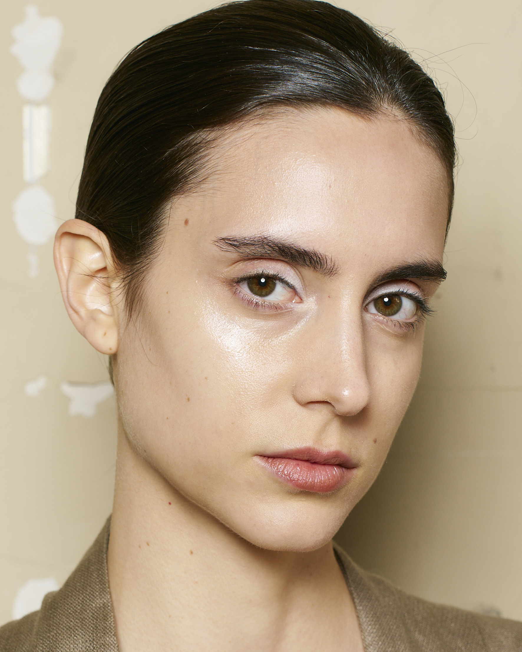 To create a smart, modern feel, artificial shine and excessive color were avoided. Foundation was applied very thinly and selectively to create a bare skin-like base. For the eyes, a soft white was blended from the inner corners, creating a pure translucent yet strong impression without making the accent makeup overly noticeable.