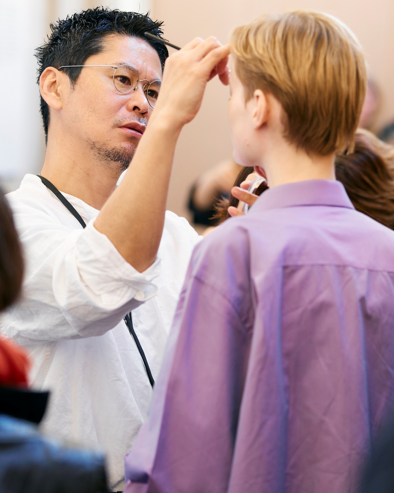 In line with the simple, sophisticated aesthetics, the hair was styled in two directions: a relaxed natural down style and a casual slick-back style. For the slick-back look, the hair was not overly tight but left with subtle nuance at the top and ends, creating a relaxed yet polished look with a touch of strength to match the softness of the looks and materials.