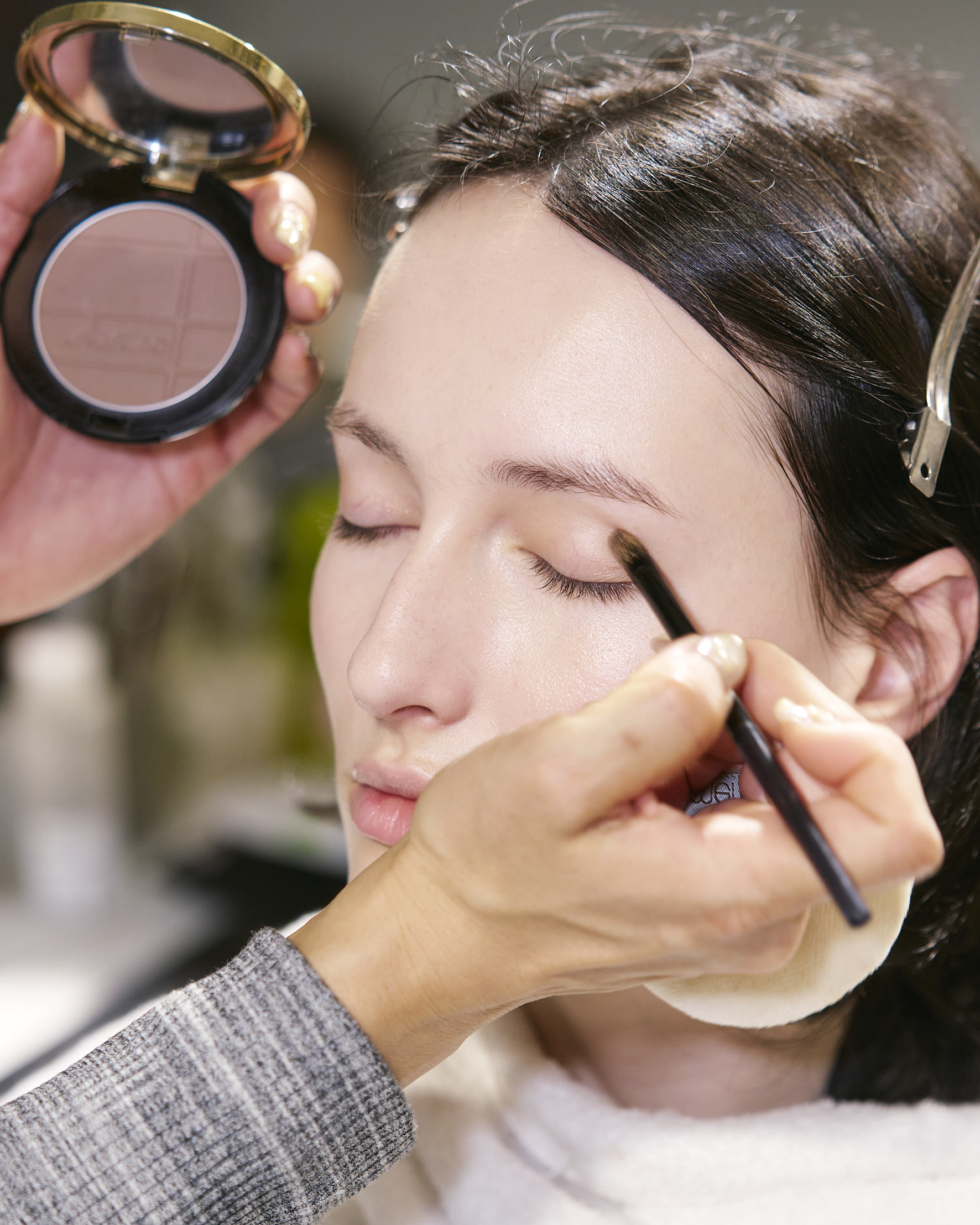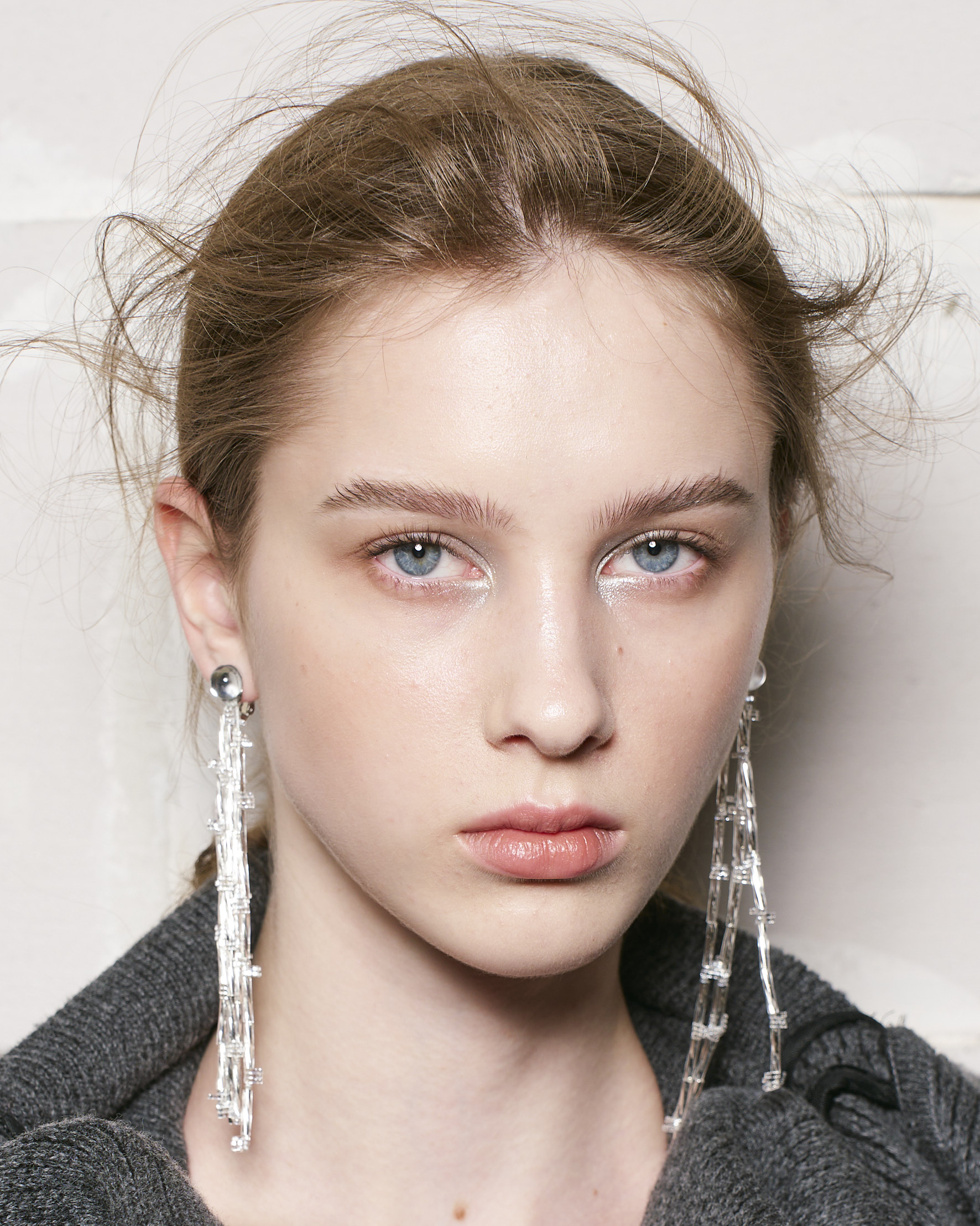 For the key accent, silver—echoing the garments—was boldly diffused at the inner corners of the eyes, creating a balance of transparency and strength.