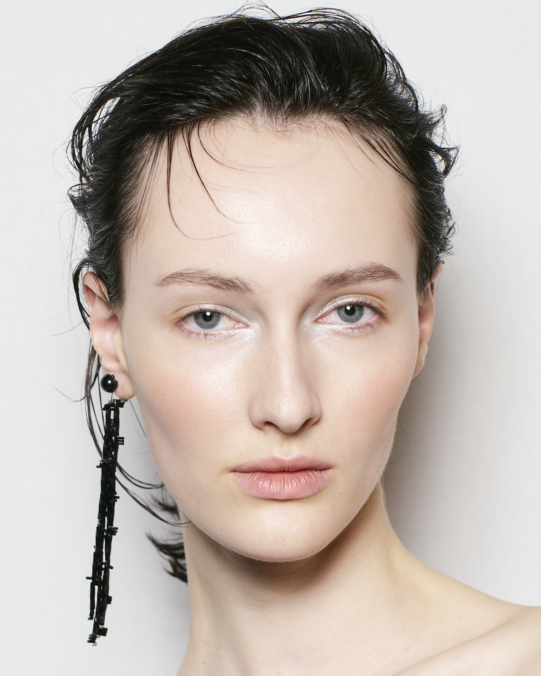 The skin was kept fresh and luminous with a light, dewy finish.