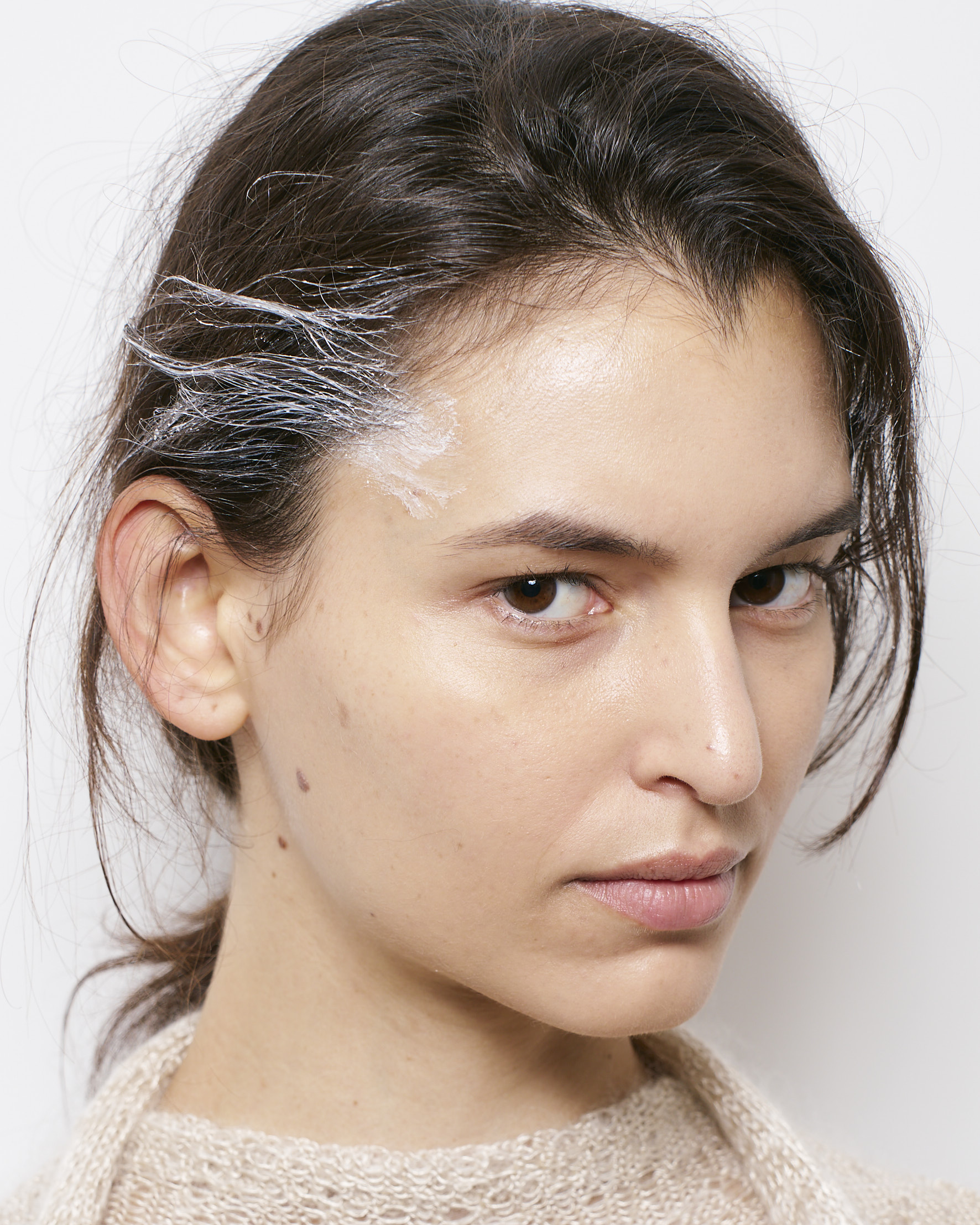 ベースは素肌感を大切にしながら、適度なカバー力とスキンケア効果を兼ね備えたファンデーションで整え、あえて眉や目もと、リップにはほとんど手を加えず、均一で美しく仕上げた肌そのものを主役にしたミニマルなバランスに。