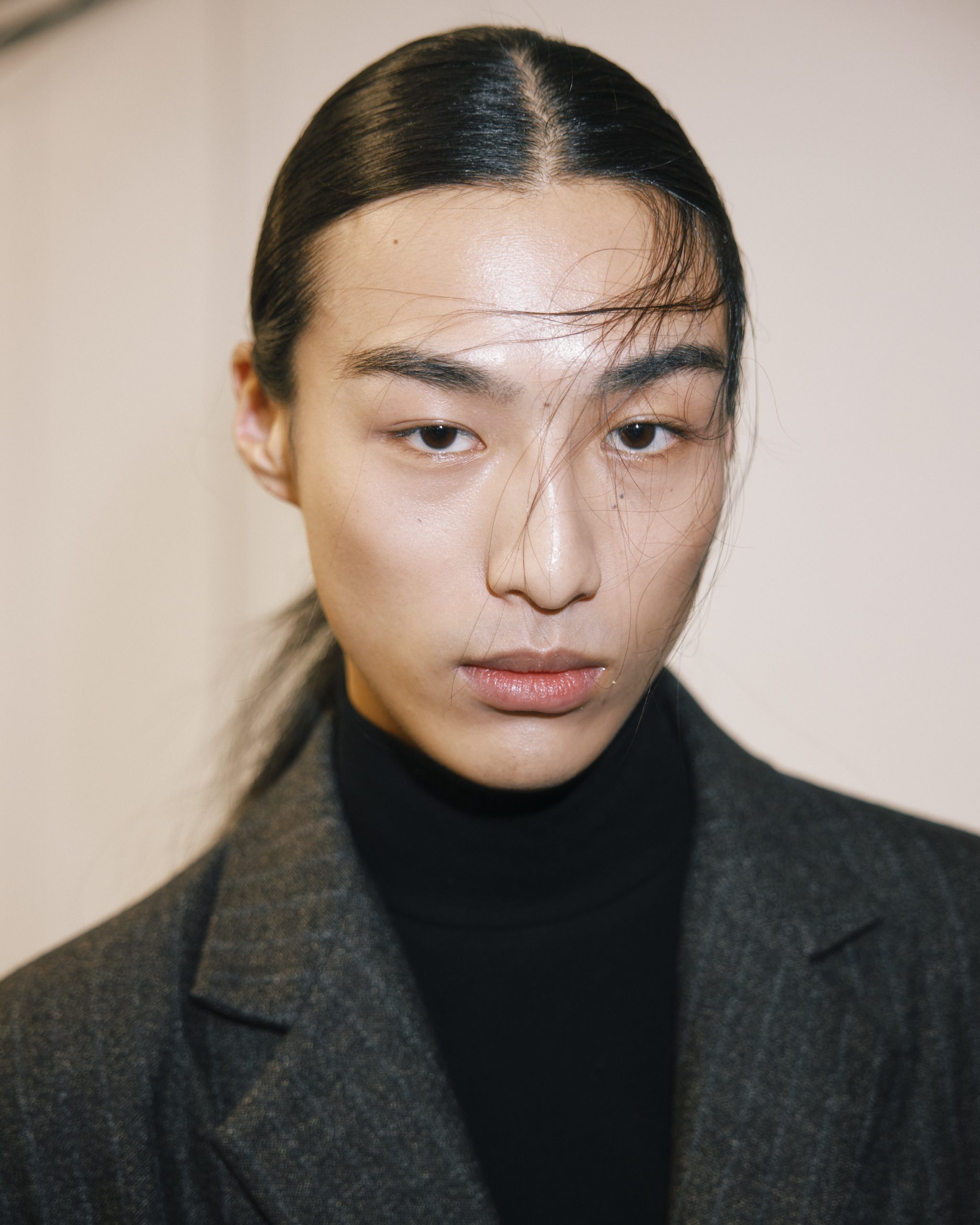 基本的にはシンプルなローポニーテールですが、フリンジ(前髪)のラフな動きで違和感を与え、ルック全体で見たときに“引っ掛かり”があるようにしています。