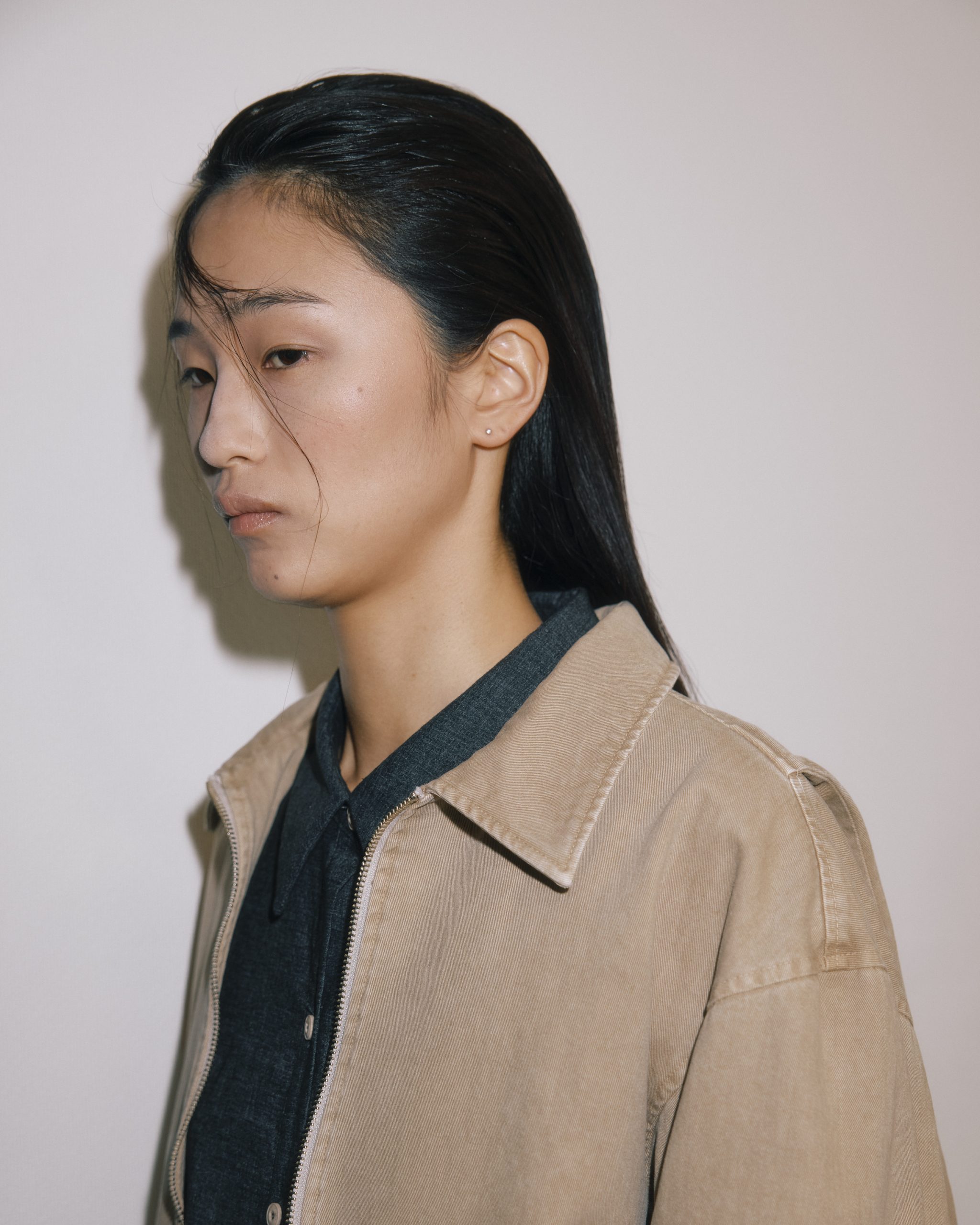 シンプルですが、ギミックが効いているデザインの服です。そのため、ヘアメイクは要素を絞って自然に洋服のディテールにフォーカスが集まるようにしました。